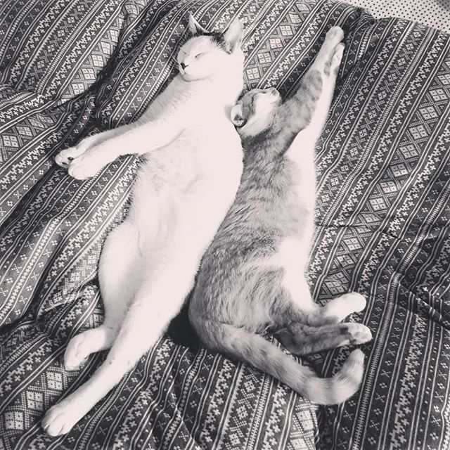 伸びきっているcocoとへっぴり腰のfumi 踊ってるようにも見えるから、お祭りに行ってらっしゃい💓 #13日はういろうの日 #13日のういろう日 #ういろう部 #cats #catstagram #ねこ #ねこすたぐらむ #にゃんすたぐらむ #猫 #ねこ部 #もちぽよ部 #ペコねこ部 #みんねこ #とら猫 #白黒猫 #ちゃしろ #茶白猫 — from Instagram 2016-12-13