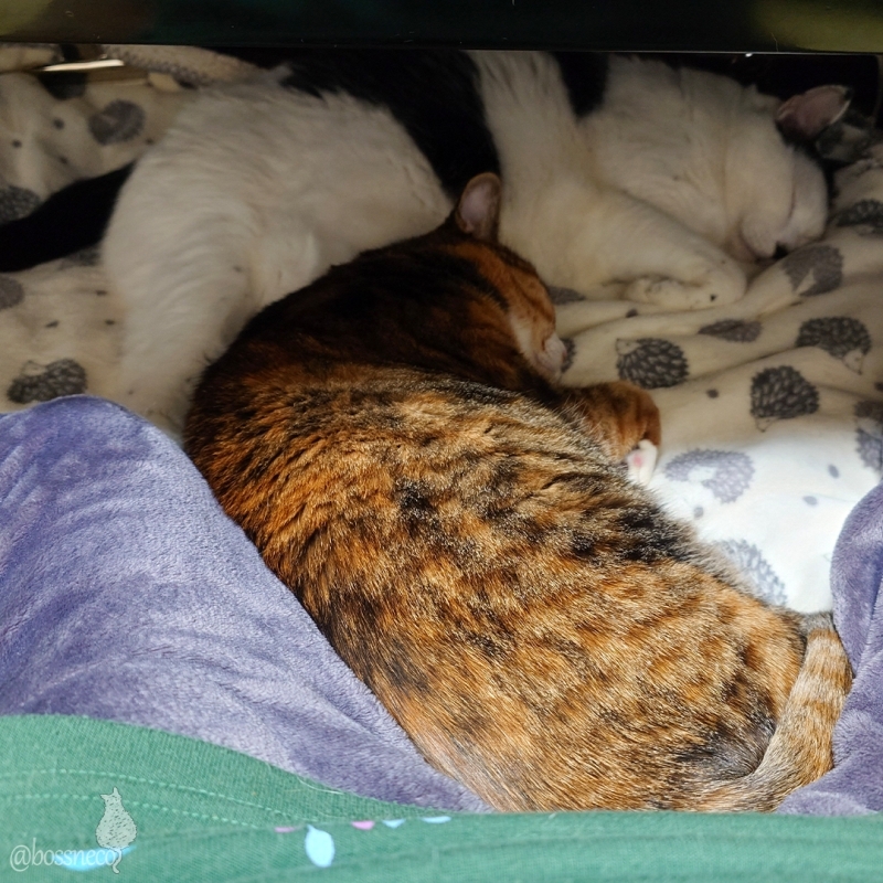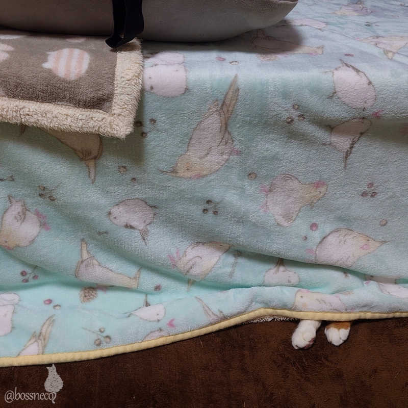テーブル下のホットマットの場所は 夜にはテーブルを毛布で包んでおこたになります エアコンついてる寝室で寝てくれない 長男cocoに付き合って お嬢様Linも一緒にここで寝ています おやすみなさい💤 #Blueskyねこ部 #CatsofBlueSky #CatsofBSky #catsky #catlovers — from Bluesky 2025-12-09