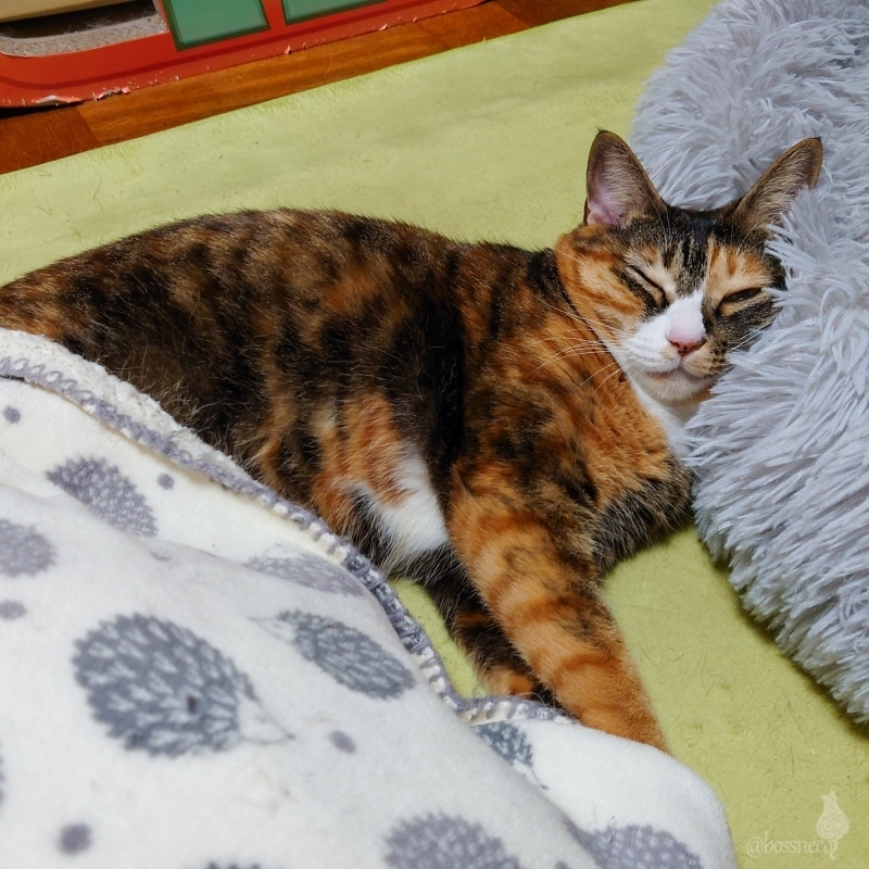 ラグの上でゴロゴロしていたら、ちょうどよい枕にハマって寝ちゃた縞三毛猫お嬢様で おやすみなさい💤