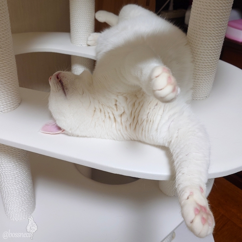 ひっくり返って寝ている白猫Ryu