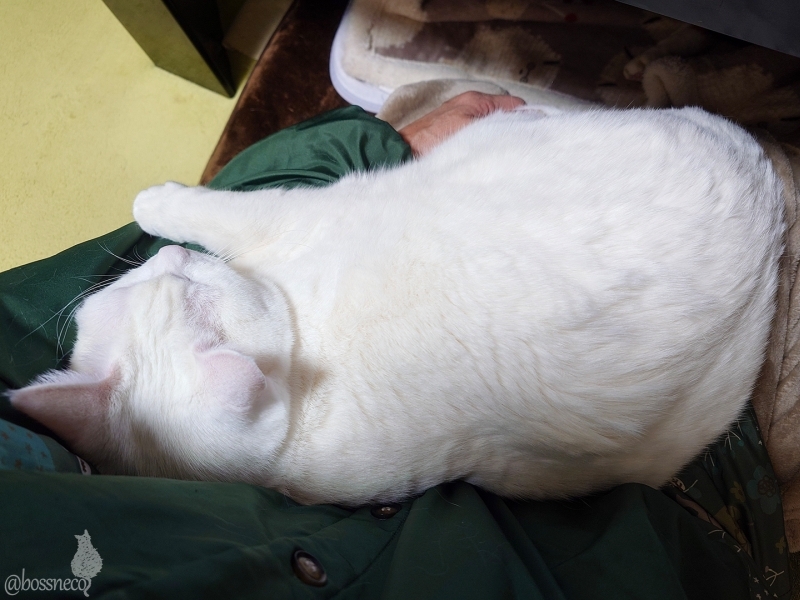 仕事してたら足をチョイチョイしてきた白猫Ryu お膝に乗せてあげたら寝ちゃいました 左腕返してほしい.. #Blueskyねこ部 #CatsofBlueSky #CatsofBSky #catsky #catlovers — from Bluesky 2025-12-25