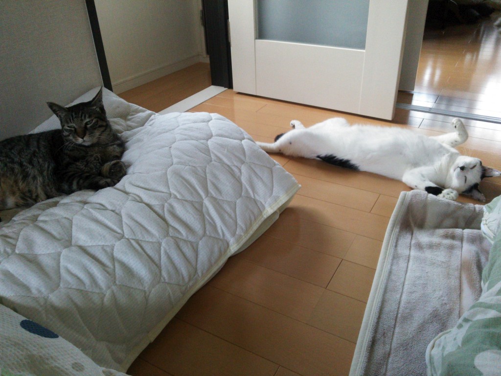 coco の開き 誰かにかまってもらうのを待ってる coco 誘われてる mark は知らんぷり << mark “やだね” coco 笑ってる?? << coco “寝てるだけだよ~” 2014-07-11