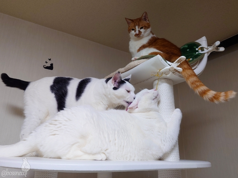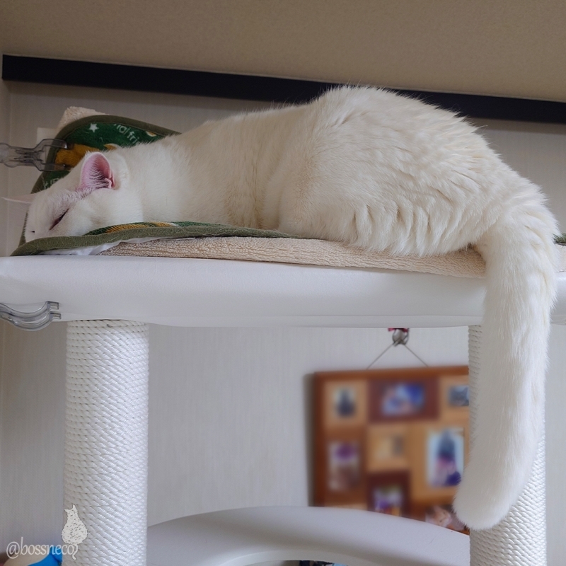 今夜は取り合いにならずに すんなりてっぺんに収まった白猫Ryu おやすみなさい💤 #Blueskyねこ部 #CatsofBlueSky #CatsofBSky #catsky #catlovers — from Bluesky 2025-11-24