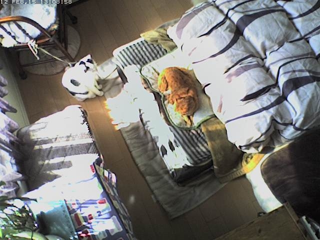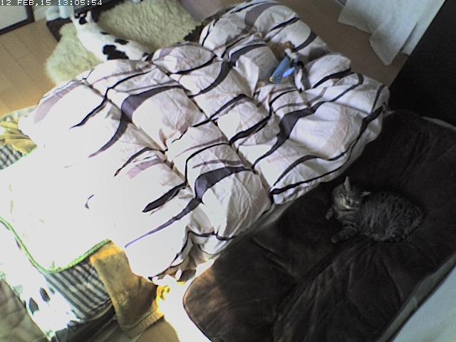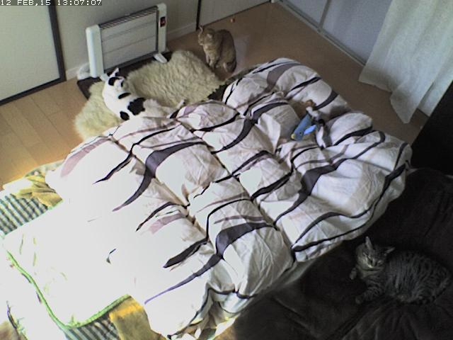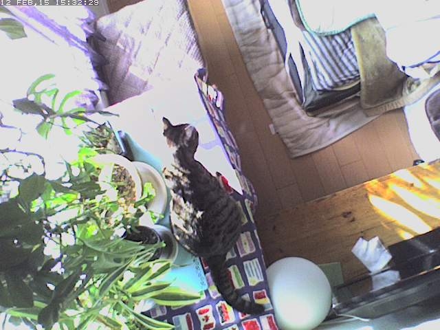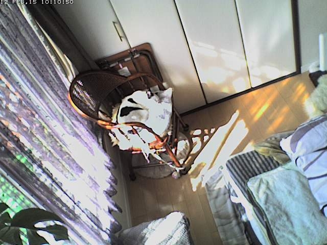 えっと、coco は? いたいた! 最近お気に入りの椅子の上。 陽があたって気持ちよさそうだね。 あれ? lanちゃんは? いたいた! << lan “そこに行きたいんですが?” << coco “ぼく、そこに行きたい!” それを見ている mark 2015-02-12