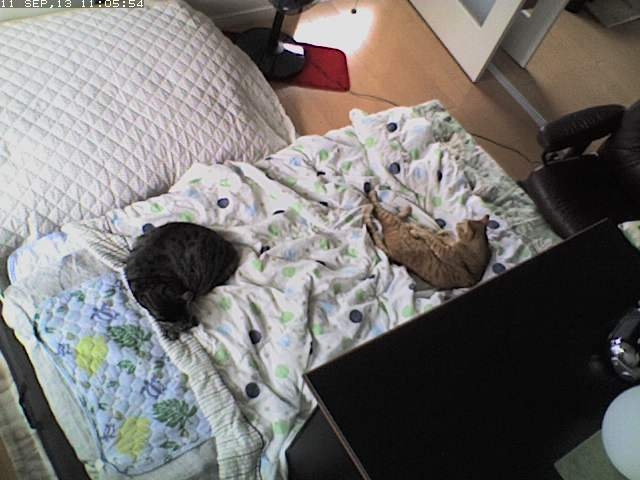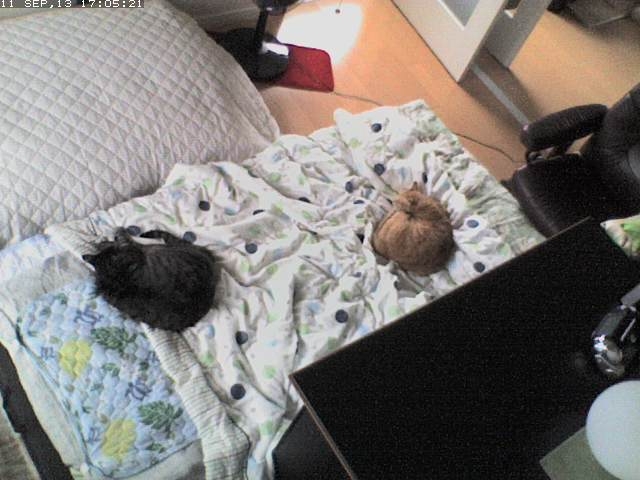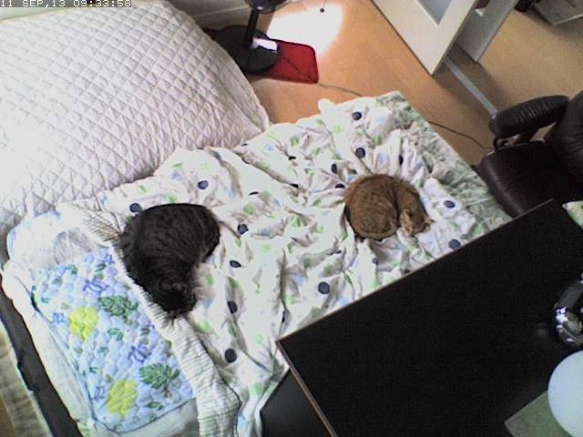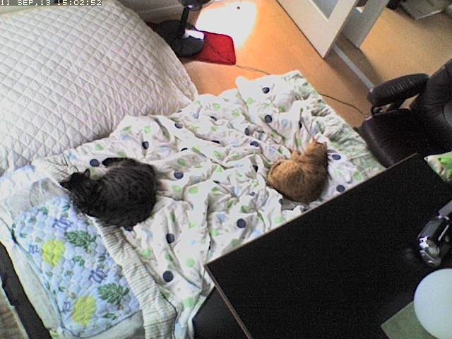 この子ら、最近布団で一緒に寝てくれるけど、冬になったら自分たちのベッド(横のでかいクッション)に戻っちゃうのかな?