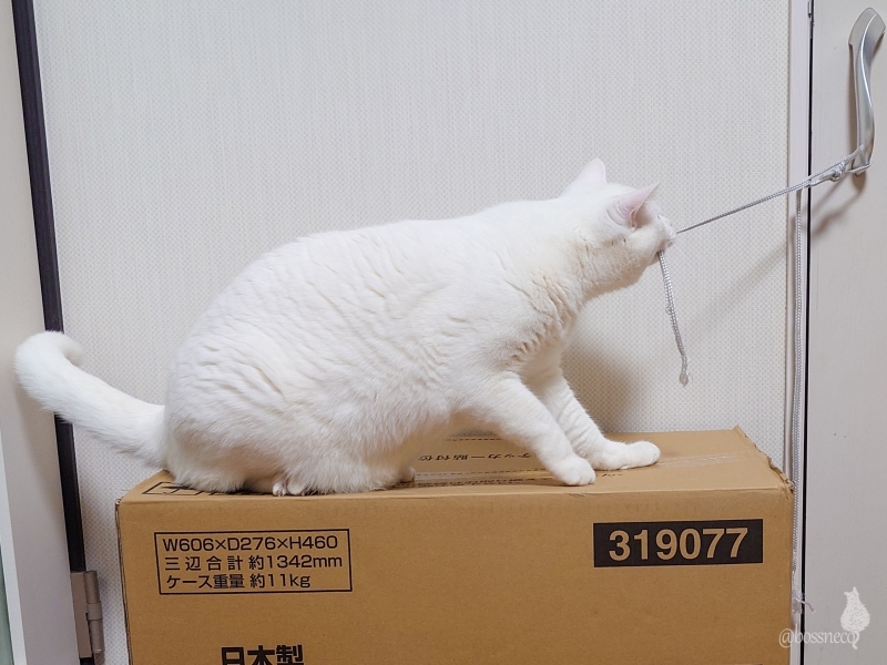 Ryuひとり綱引きで遊ぶ白猫Ryu