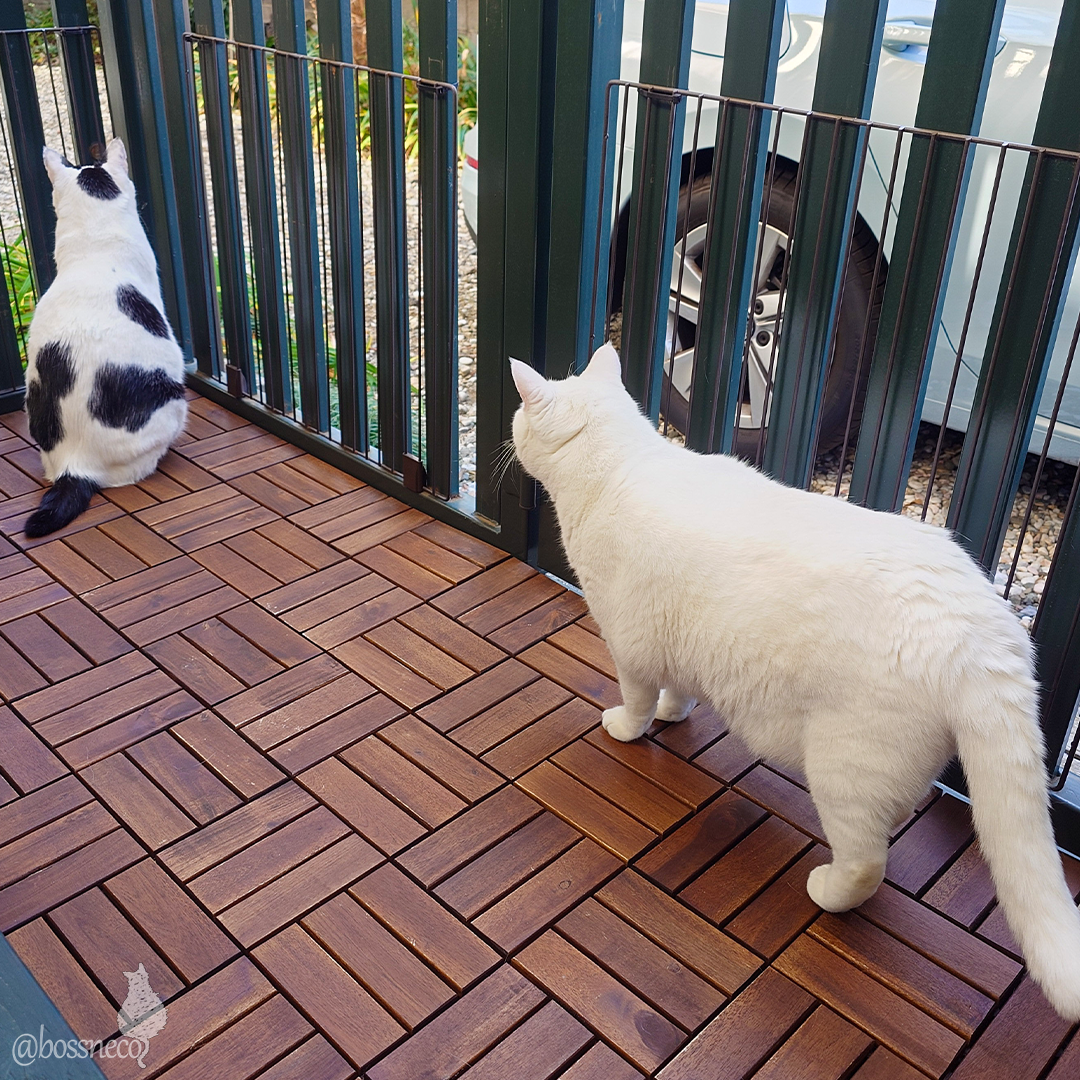 お外で物音がするので見に行った白黒coco へっぴり腰でも見たい白猫Ryu お隣さんが物置棚でなにかやってるみたい 大丈夫ですよ☝ #Blueskyねこ部 #CatsofBlueSky #CatsofBSky #catsky #catlovers — from Bluesky 2025-12-01