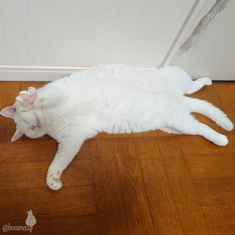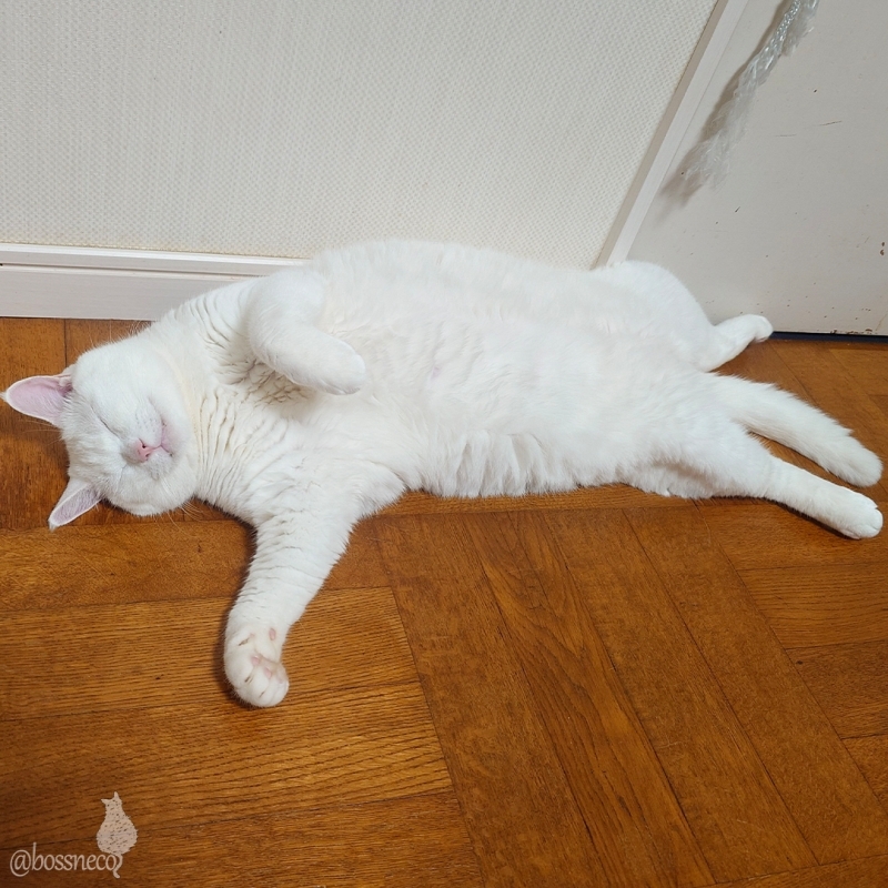 香箱座りでぼんやりしている子と 見にきた子と へそ天の子 にゃฅ おやすみなさい💤 #Blueskyねこ部 #CatsofBlueSky #CatsofBSky #catsky #catlovers — from Bluesky 2025-08-12