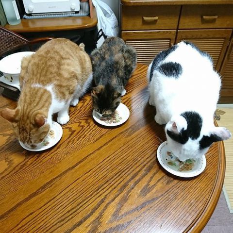 カリカリを大袋からビンに入れ替えていると…どこにいても必ず集まってくる子ら🤣