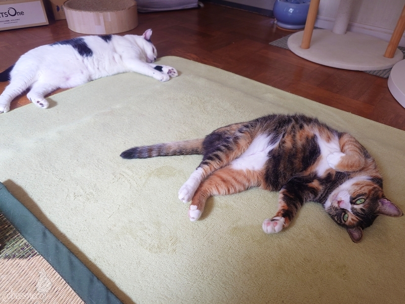 蒸し暑いけど朝はやっぱりニャルソックから.. ちゃんと警備しているのは茶白fumiだけね 暑くなってきたらお部屋でごろりん #Blueskyねこ部 #CatsofBlueSky #CatsofBSky #catsky #catlovers — from Bluesky 2025-09-09