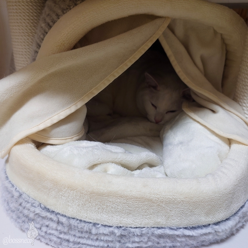 Ryu最近夜中もこのドームベッドで寝ている白猫Ryu