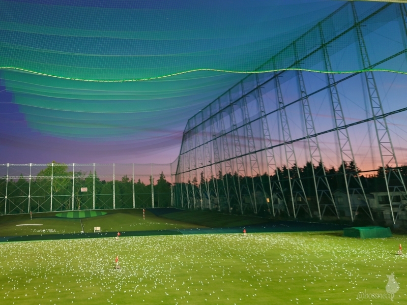 ゴルフ練習場で夕焼けとネットのグラデーションがきれいだったのでパチリ📸