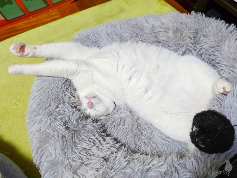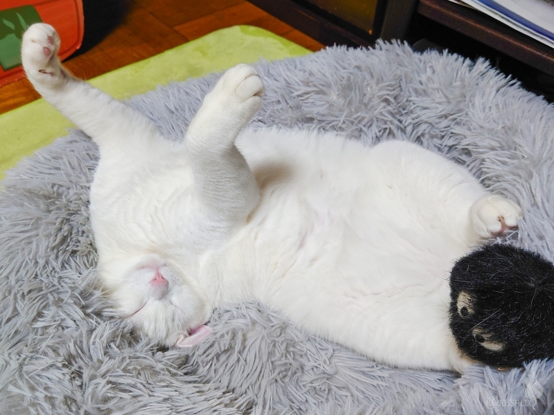 ベッドでひっくり返って寝ている白猫Ryuで おやすみなさい💤