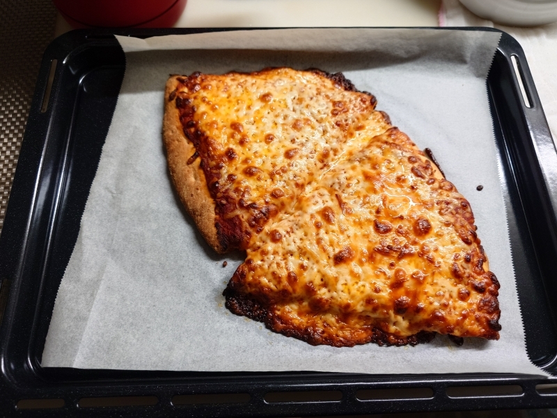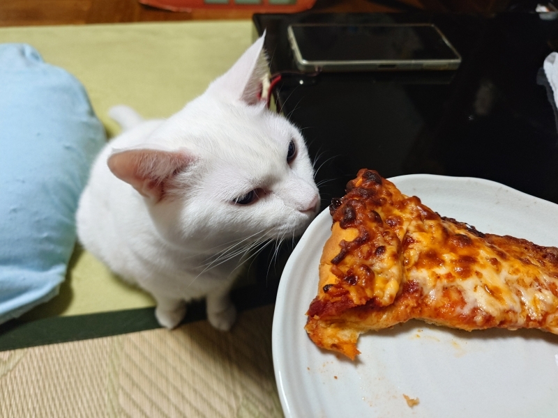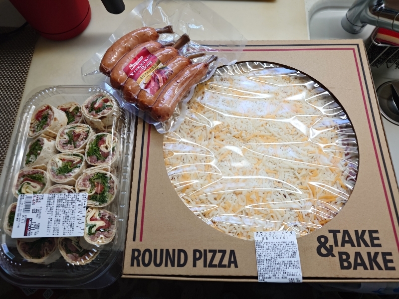 コストコ帰りの地元の友人からいただいた ハイローラー、ピザ、ソーセージ ピザは生なのでオーブンで 200℃で15分 書いてあるとおりに焼いたらちょっと焦げちゃった.. でもチーズがカリカリになって美味しくいただきました Ryuもちょっとだけチーズをペロリ 2024-08-09