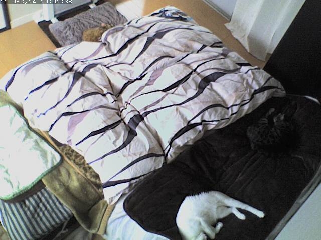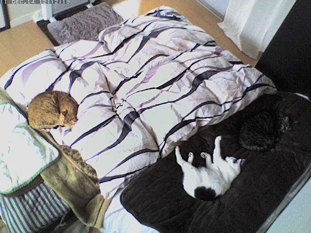 今日はどんよりした日なので、mark がいちだんと見えにくいです。 lanちゃんはすっかりヒーターにくっついてます。 coco がゴロゴロしてます。 「ホットマットで3匹そろって寝」の計画はダメな感じですかね。 (どんな計画??) ごろ~ん してからの のびのび~ 2014-12-11