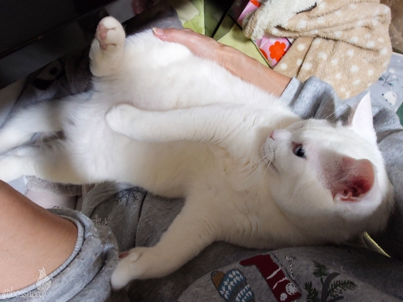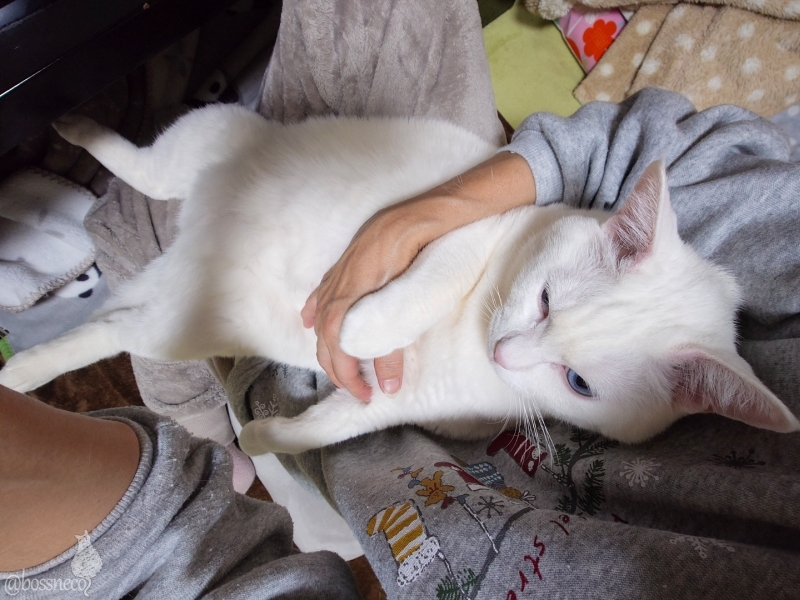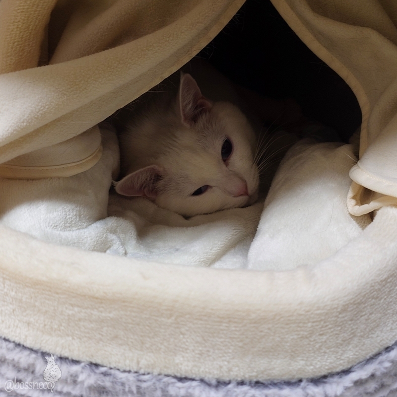夜はドームベッドに籠もりっきりの白猫Ryu 寂しいからたまには出てきてー おやすみなさい💤 #Blueskyねこ部 #CatsofBlueSky #CatsofBSky #catsky #catlovers — from Bluesky いま出てきてくれて お膝抱っこを所望されました♡ よろこんで! 2026-02-15