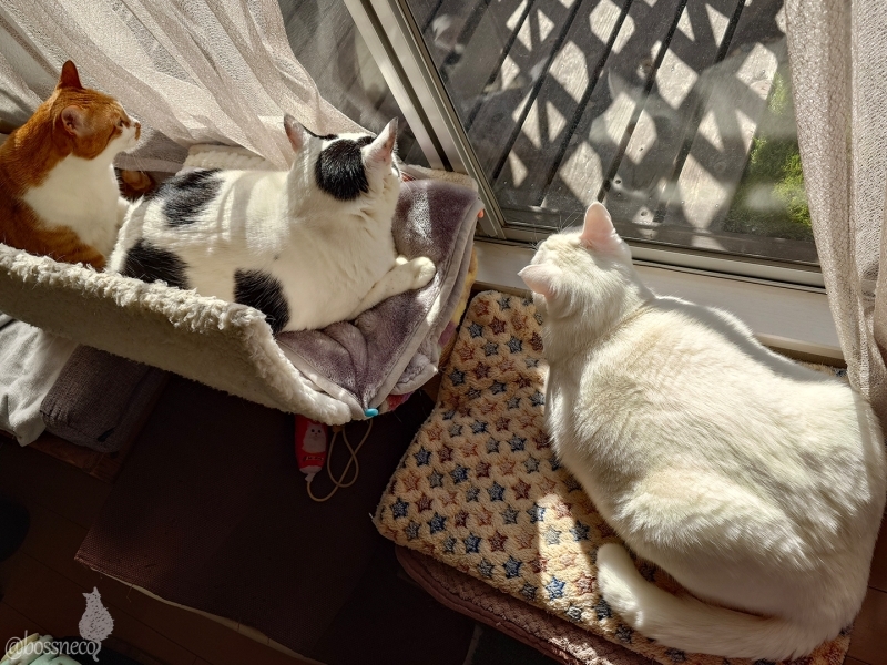 今朝のベランダニャルソック中の写真はお嬢様だけ 男の子ズは早々にぽかぽか窓辺ニャルソック #Blueskyねこ部 #CatsofBlueSky #CatsofBSky #catsky #catlovers — from Bluesky 2026-01-25