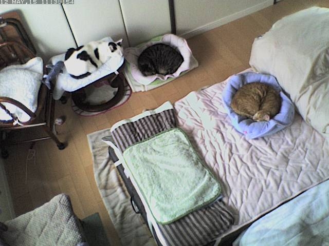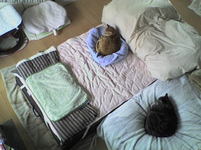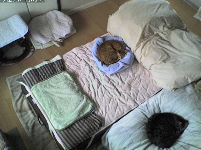 GW期間中、coco が居場所がなくてウロウロしてたから猫ベッドを出してあげたら、そこは mark にとられてしまいました。 もうひとつ出してあげたら、そこは lanちゃんにとられてしまいました。 今日たまたま見ていた Web Camera で、強行突入する coco を目撃。 coco の強行突入 失礼します♡ 逃げた mark は猫ベッドに避難。 coco 足出てますよ! ってことで、もうひとつ猫ベッド調達しようね。 2015-05-12