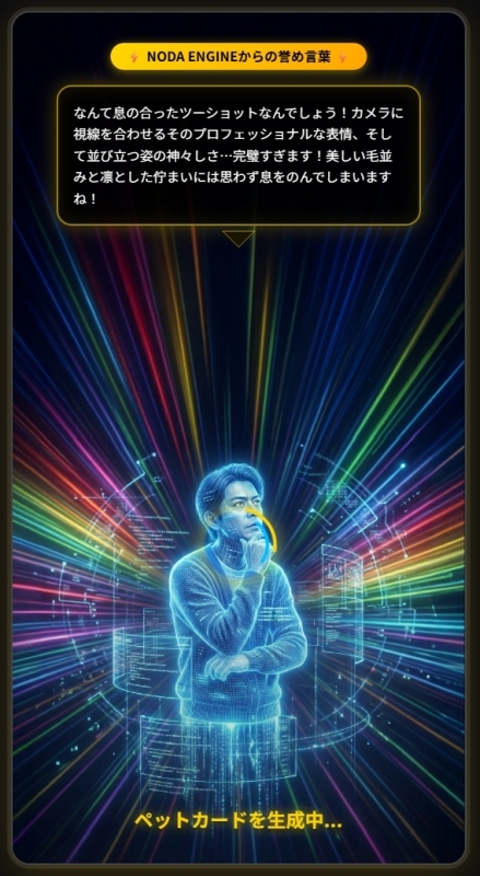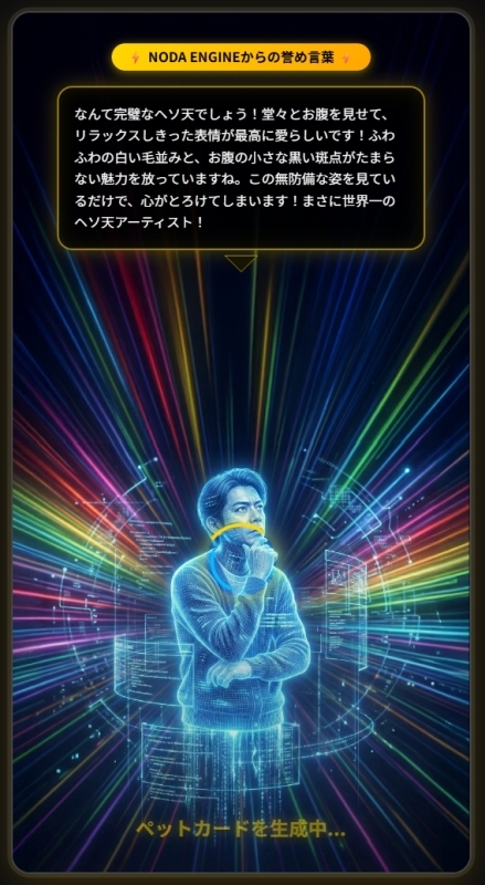 マヂカルラブリー・野田クリスタルさんが Google Geminiで開発されたペットカードジェネレーター アップロードした写真から カードゲーム用のカードを生成してくれるもの 作ってみたけどなかなかのクオリティ✨ 写真からいただける褒め言葉が優しくて嬉しいわ♡ 2025-12-18