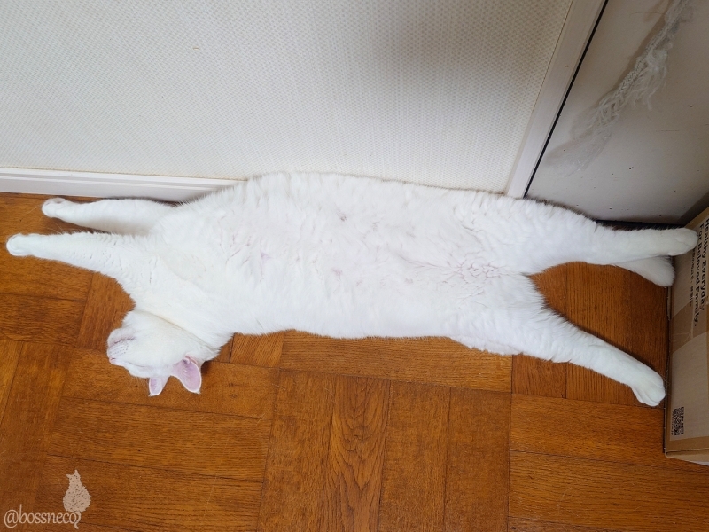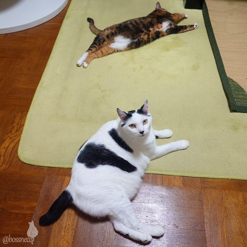 また壁にくっついてヘソ天で転がってるのね! ってあっちを見たら お嬢様も目一杯伸びてました おやすみなさい💤 #Caturday #Blueskyねこ部 #CatsofBlueSky #CatsofBSky #catsky #catlovers — from Bluesky 2025-08-30