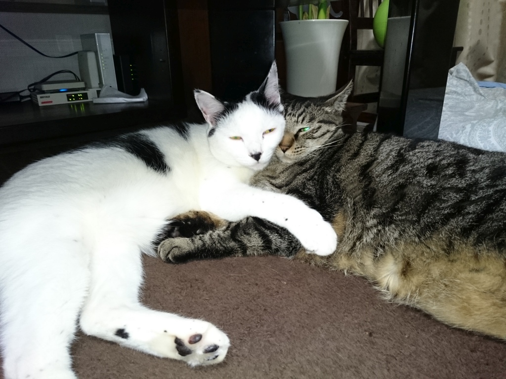 今日も coco は mark にぴったりくっついてます。 mark の顔を抱きしめてグルーミング中。 と思ったら、くっついて寝てしまいました。 mark のことをほんとに大好きなんだね。 mark も優しいから我慢、がまん? 2014-12-21