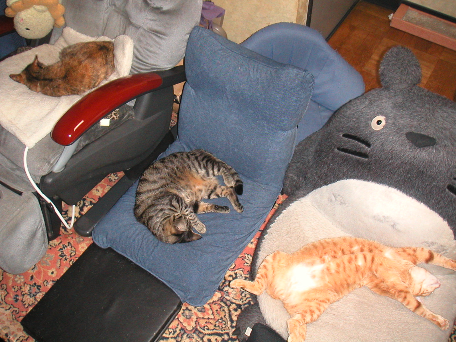 猫のみなさんにはそれぞれにベッドがあるけれど、私たちは座るところがないんです。