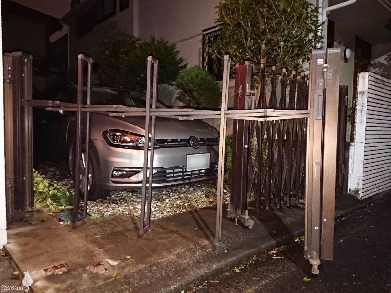 駐車場の伸縮フェンスが伸び切って道路側に飛び出してました