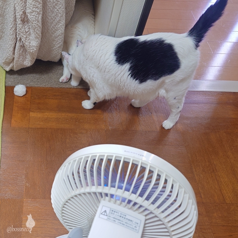 Ryu扇風機の風を背中で受け止めている子の
