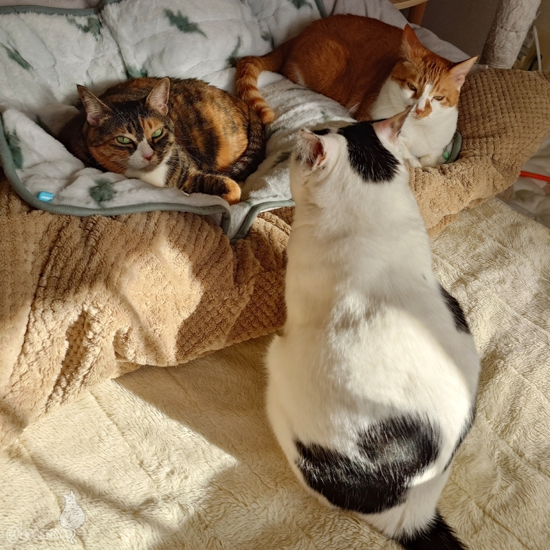 お気に入りの場所を取られて 圧をかけている白黒coco しかたないなーって あきらめて座り込んだら 白猫Ryuがきた! #Blueskyねこ部 #CatsofBlueSky #CatsofBSky #catsky #catlovers 実ははまだ仕事中、もう少しが終わらない.. — from Bluesky 2025-12-29