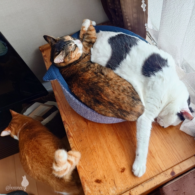 丸いベッドを夏仕様に変えたけど ちょっと小さくてギューギューね #ねこ部 #猫部 @catclub.bsky.social #楽しい我が家 #こんな毎日が大切 #毎日が猫祭 #猫好きさんと繋がりたい — from Bluesky 2024-06-13
