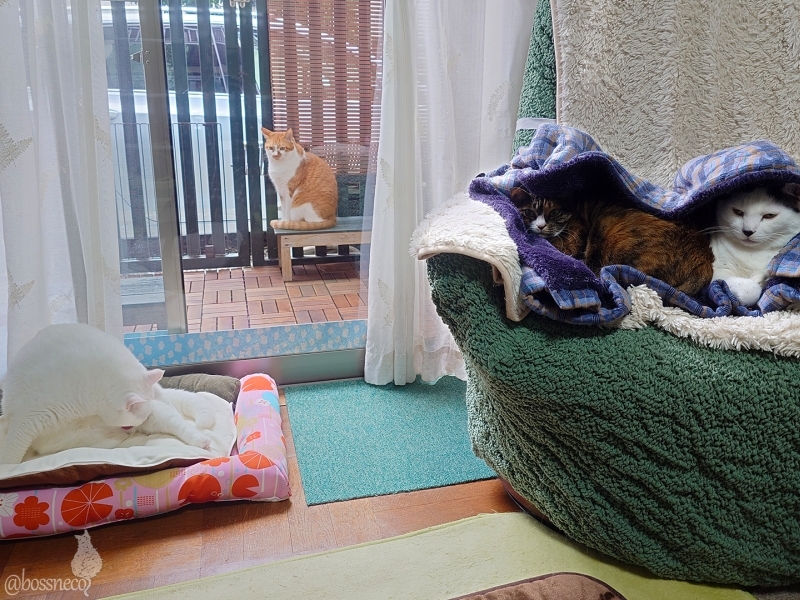 coco & fumi & Lin & Ryuみんなが一斉に見ているのはゴミの収集車