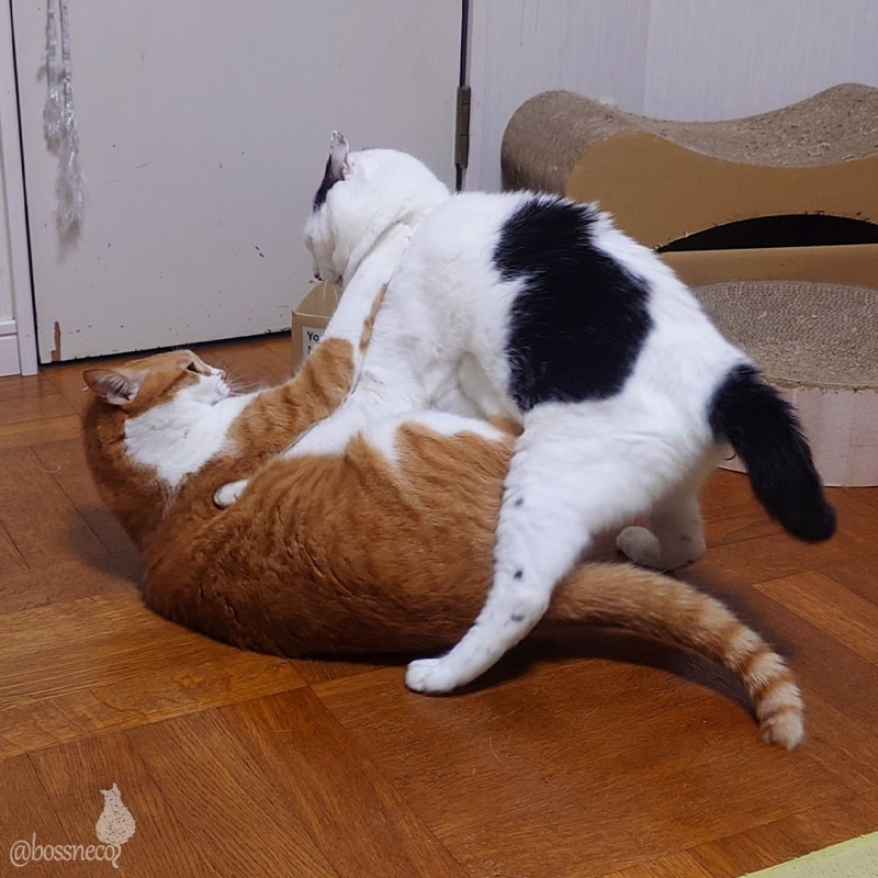 12歳の白黒cocoに 果敢に戦いを挑む 9歳の茶白fumi ふたりともいつまでも元気でいてね #Blueskyねこ部 #CatsofBlueSky #CatsofBSky #catsky #catlovers — from Bluesky 2025-08-08