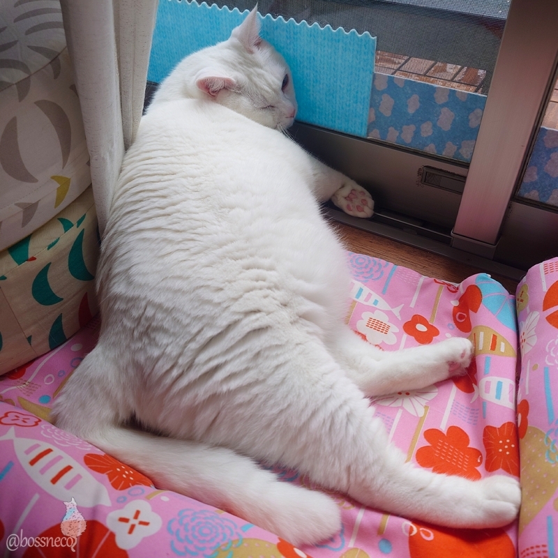 ガラス窓にお顔を貼り付けて寝ている白猫Ryu 椅子カバーの中に集まっている子たち 暇そうなので遊んであげることにします #Blueskyねこ部 #CatsofBlueSky #CatsofBSky #catsky #catlovers — from Bluesky 2025-09-04