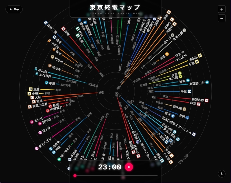 首都圏の終電が徐々になくなっていく様子を可視化した「東京終電マップ」