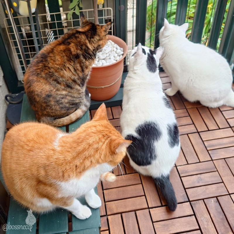 庭の奥の枯れた草が揺れているのが気になる子たち 何もいませんよ! きれいに刈ってまいりました👌 #Blueskyねこ部 #CatsofBlueSky #CatsofBSky #catsky #catlovers — from Bluesky 2025-11-23
