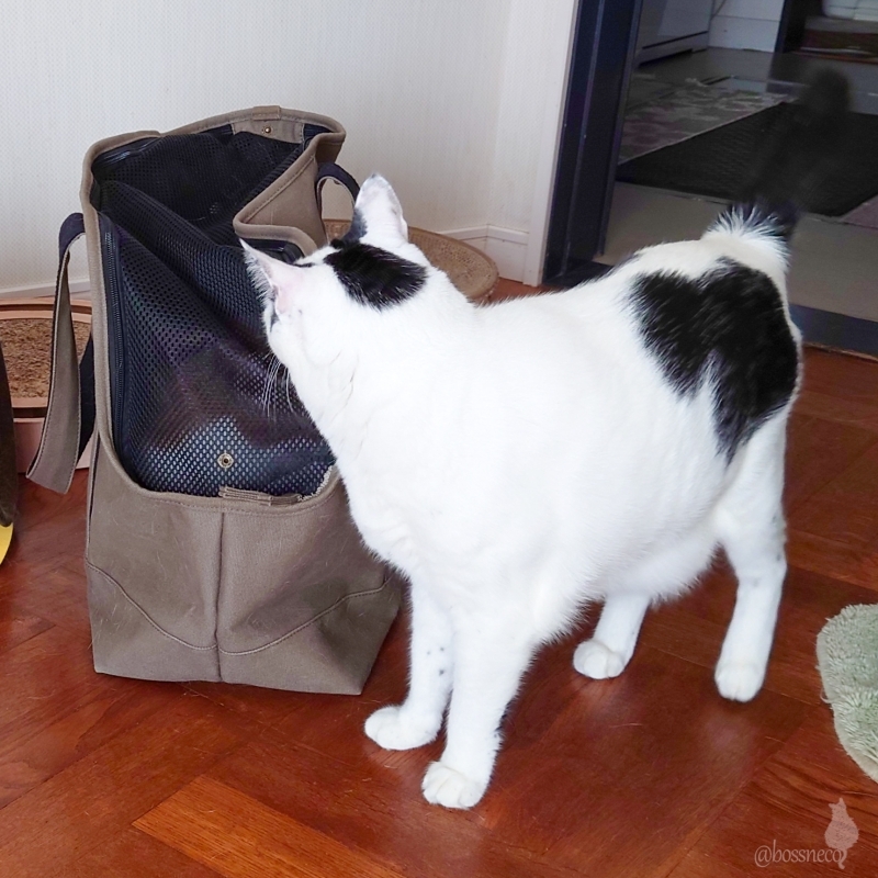 検査のためにキャリーインされてギャン泣きの次男茶白猫を気遣う長男白黒猫