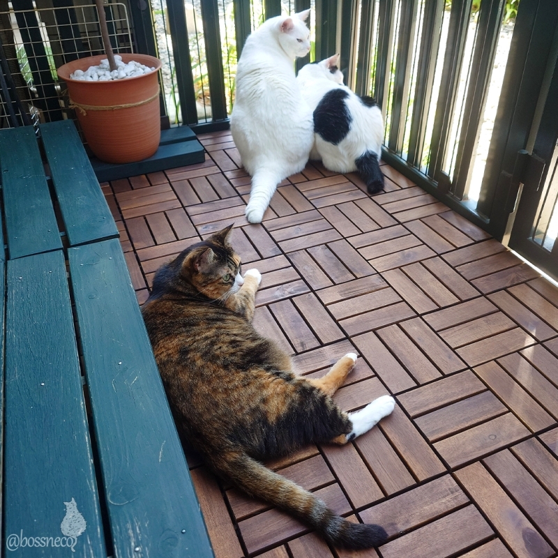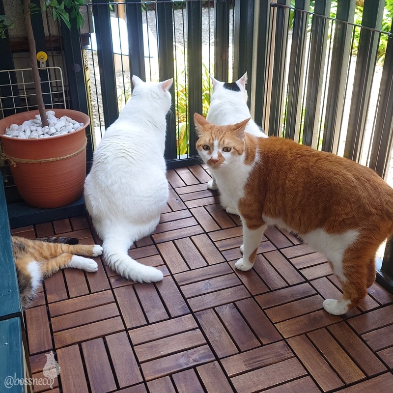 皆さん何かが気になる様子 このあと お隣りの敷地で草刈り機発動 準備のために人の声がしてたのね 凄い音にびっくりして部屋に戻ってきた白猫Ryu お目目まん丸(ΦωΦ)ฅ #Blueskyねこ部 #CatsofBlueSky #CatsofBSky #catsky #catlovers — from Bluesky 2025-07-22