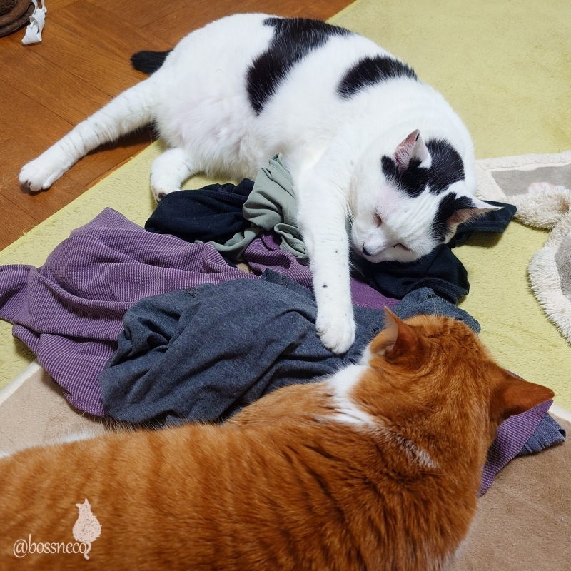 洗濯物を抱えて寝てしまった 白黒cocoと茶白fumi そろそろ片付けたいので起きてください #Blueskyねこ部 #CatsOfBlueSky #楽しい我が家 #こんな毎日が大切 — from Bluesky 2025-04-27