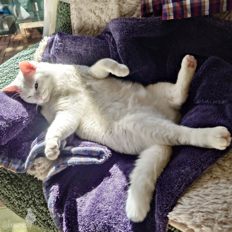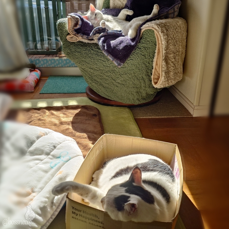朝の続き 箱を兄ちゃんに取られちゃった?白猫Ryuは 椅子の上でヘソ天になって兄ちゃんを見てました どーしてこーなったのか過程を見たかったわ #Blueskyねこ部 #CatsofBlueSky #CatsofBSky #catsky #catlovers — from Bluesky 2025-11-04