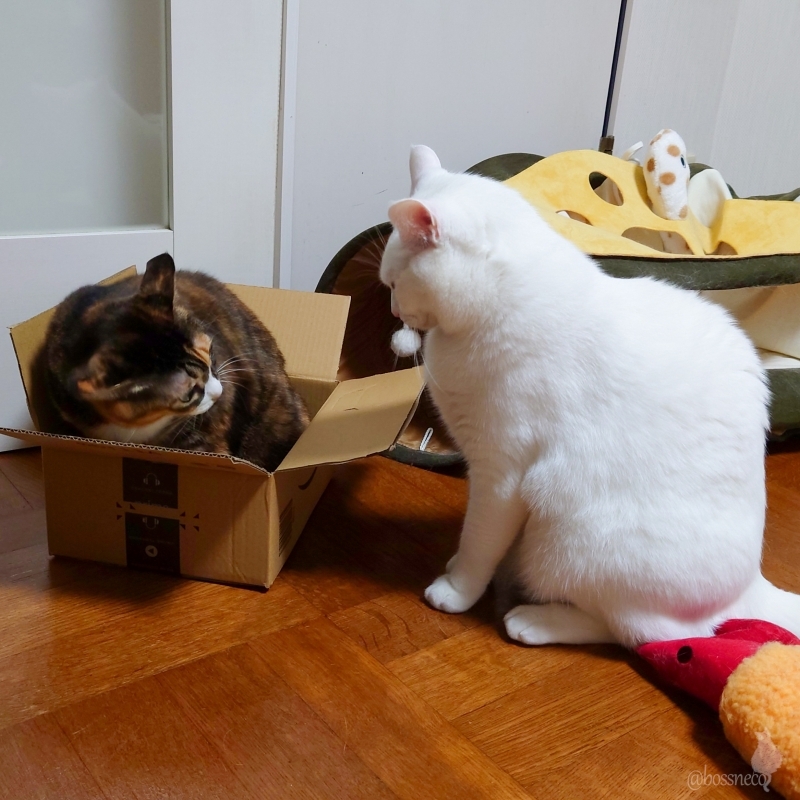譲って欲しい末っ子白猫と、譲りたくない縞三毛姫