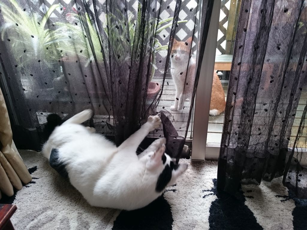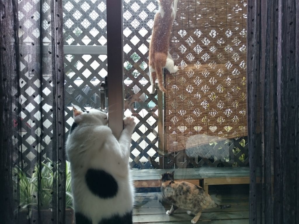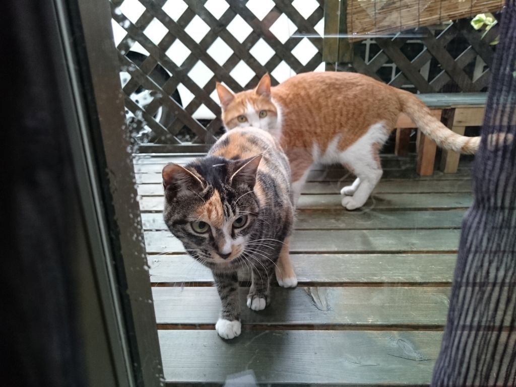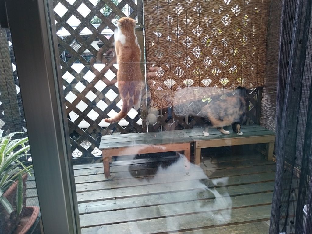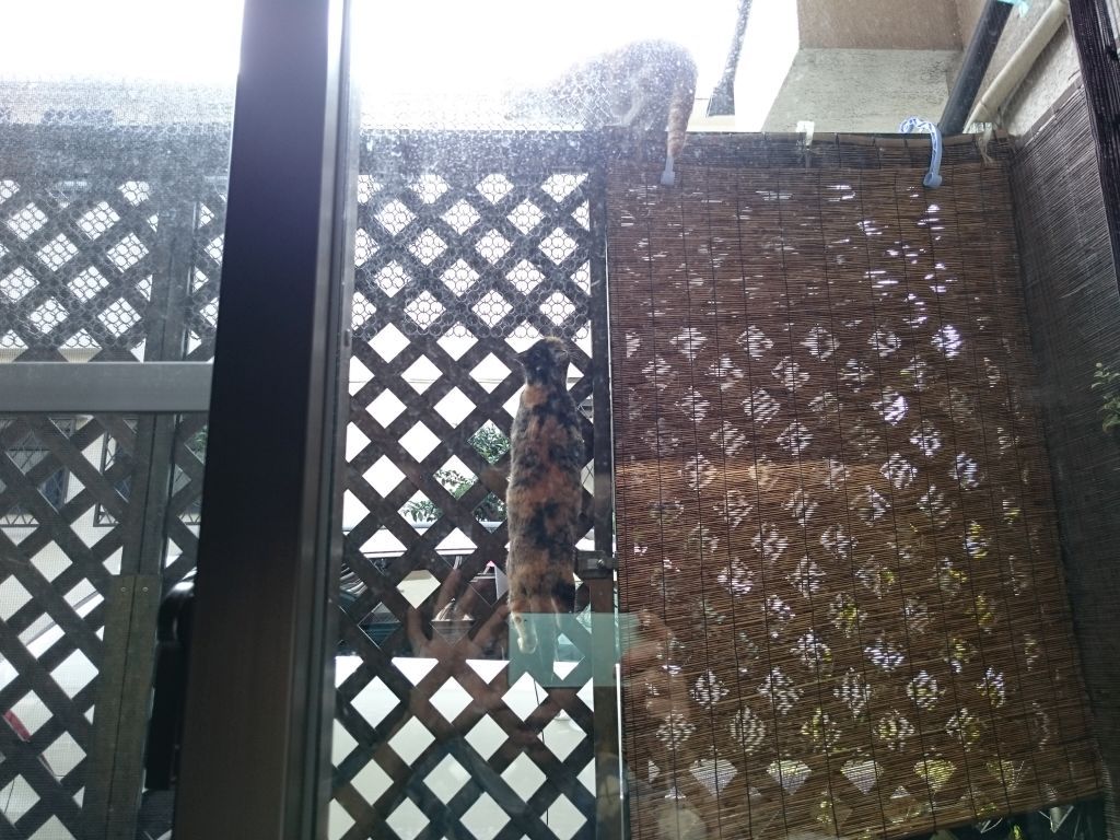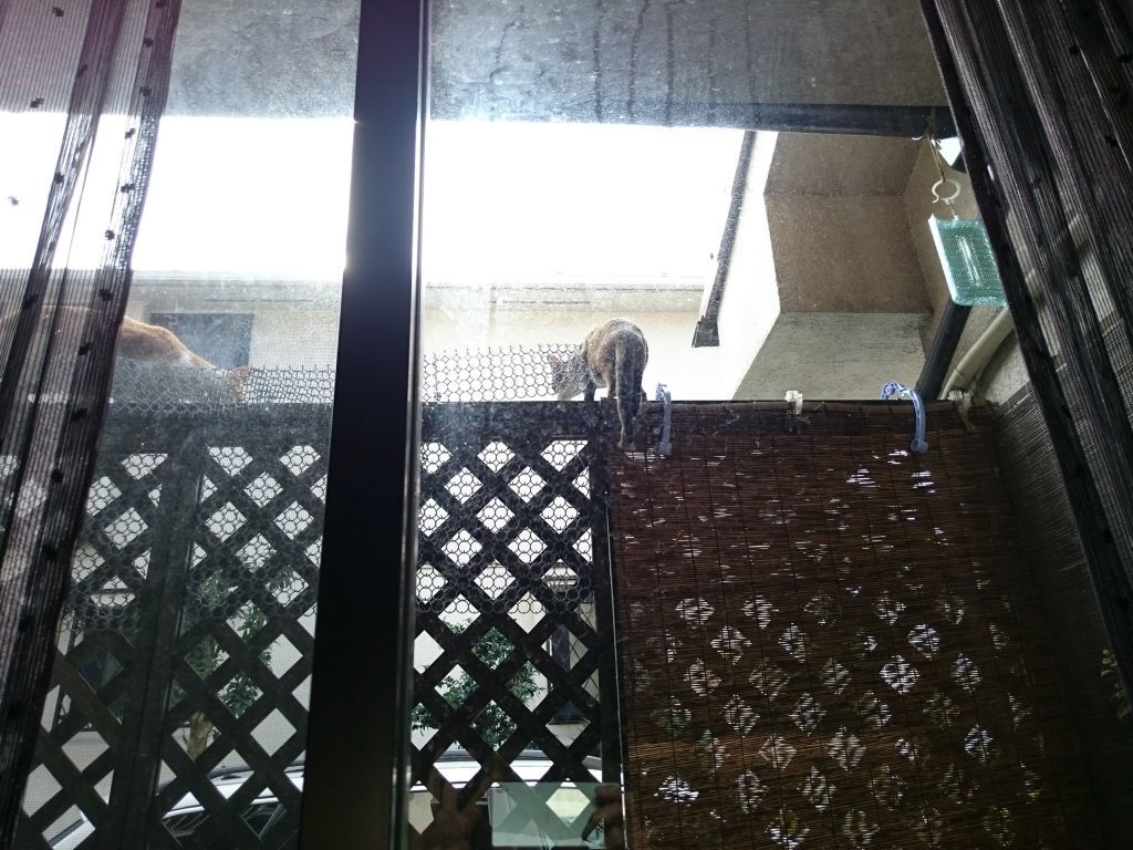 ここ最近、良く遊びに来る野良の親子。 今日はベランダの中まで遊びに来ました。 coco 大興奮 やばいと思ったのか、まずはママから脱出。 そこから!?って感じだけど、器用によじ登って.. チビ子も真似してママに続きました。 上手に登るもんだなぁ…って感心して見てたけど、このベランダはうちの子たちの憩いの場。 どうしましょ。 2015-12-27