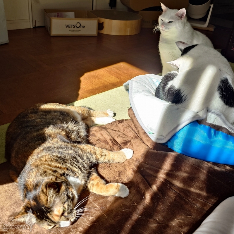 今朝は寒くてニャルソックタイムは一瞬 (写真撮る間もなく..) タワーから陽向にやってきた白猫Ryu そのまま写真奥の箱に入っていったので 箱ごと陽向に移動してあげました #Blueskyねこ部 #CatsofBlueSky #CatsofBSky #catsky #catlovers — from Bluesky 2025-11-04