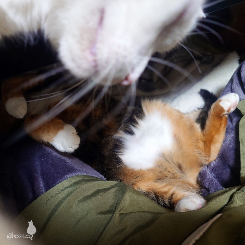 ファンヒーターの暖かい風が届くところに集まる子たちと おまたでヘソ天になっている子 ヒーターの上の子はちょっと寒そうね #Blueskyねこ部 #CatsOfBlueSky #楽しい我が家 #こんな毎日が大切 — from Bluesky 2025-01-20