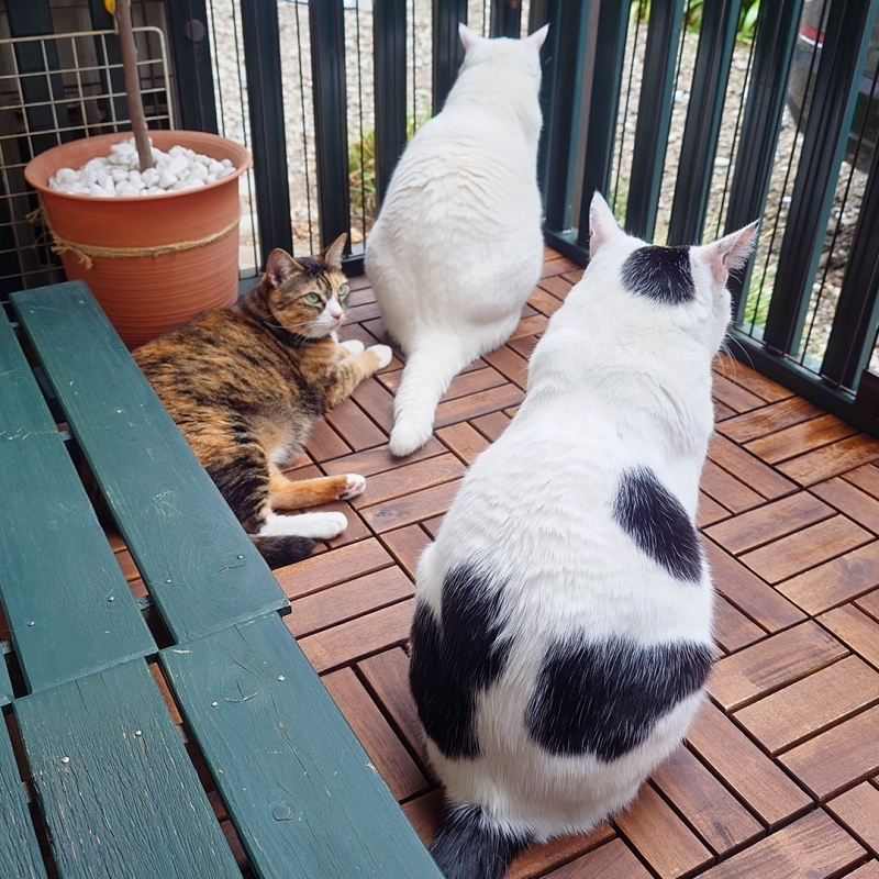 2週間ぶりの雨☔ 雨の匂い 土が濡れた匂い 雨上がりにみんなで堪能 このあと第2弾の雨雲到来☔ #Blueskyねこ部 #CatsofBlueSky #CatsofBSky #catsky #catlovers — from Bluesky 2025-08-01