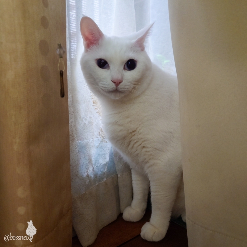 Ryu雷🌩️に驚いてカーテンに隠れた白猫Ryu