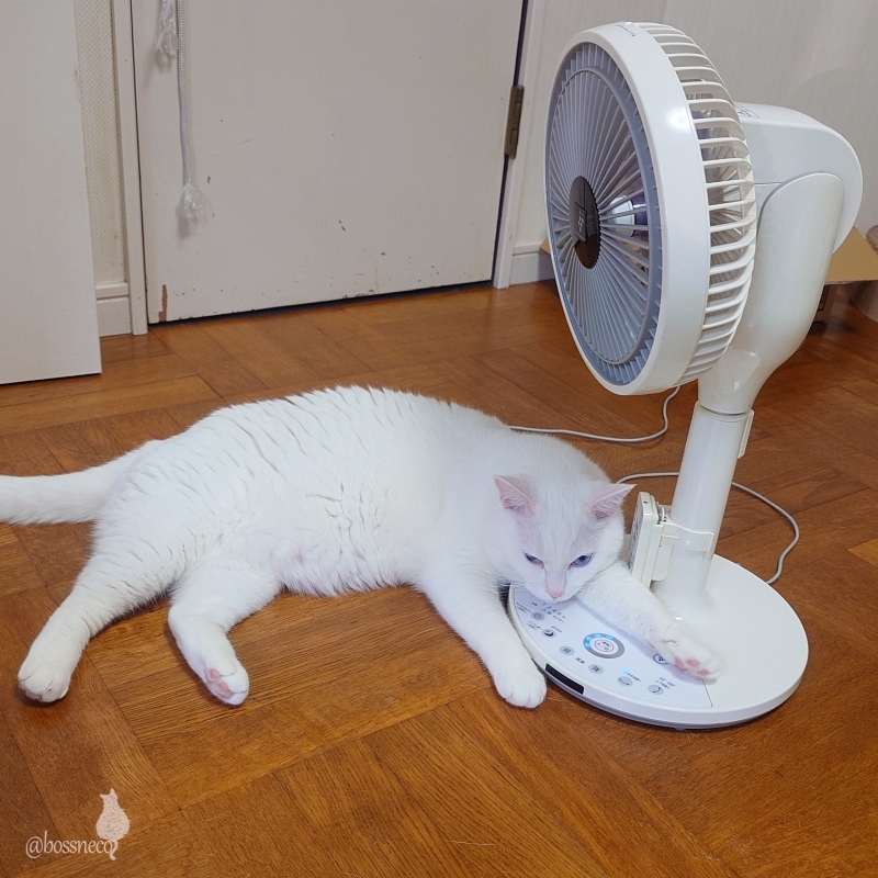 そこ、風きてる? 朝はまだ涼しいので扇風機 そろそろエアコンつけましょうか #ねこ部 #猫部 @catclub.bsky.social #楽しい我が家 #こんな毎日が大切 #毎日が猫祭 #猫好きさんと繋がりたい — from Bluesky 2024-07-05