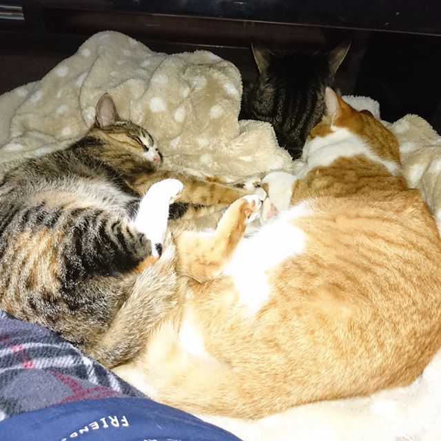 とりあえず今夜は3色の塊ができました💕 markにくっついて寝てるfumiのそばにLinを置いてみたら、Linがとっても嬉しそうな格好で寝てくれました❣ cocoは…やっぱり棚の上です😊 #cats #catstagram #ねこ #ねこすたぐらむ #にゃんすたぐらむ #猫 #ねこ部 #もちぽよ部 #ペコねこ部 #みんねこ #黒さば #黒きじ #きじとら #とら猫 #ちゃしろ #茶白猫 #縞三毛 #しまみけ — from Instagram 2017-01-19