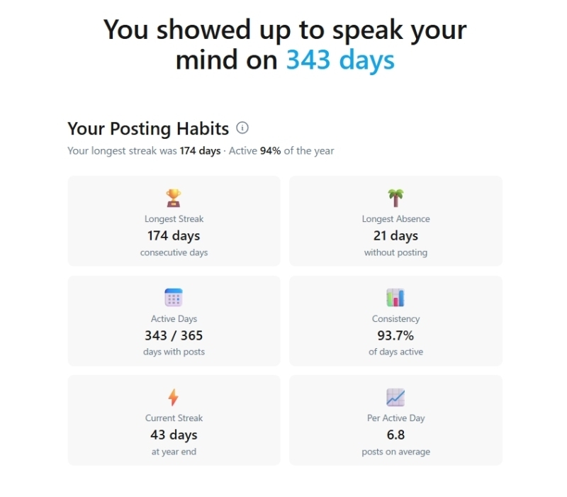 📅アクティブデイズ 343 / 365 投稿日数