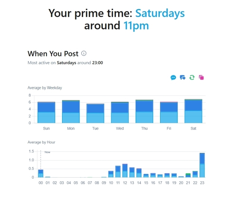 土曜日の23時頃が最も活発です
