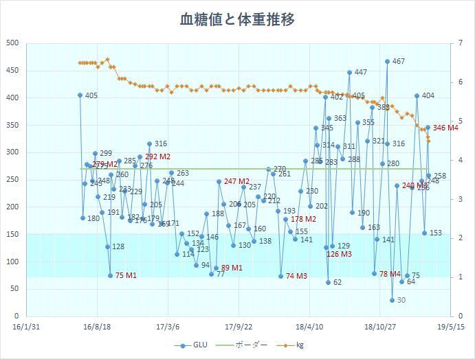 血糖値:午前中 258mg/dL / 18:30 140mg/dL